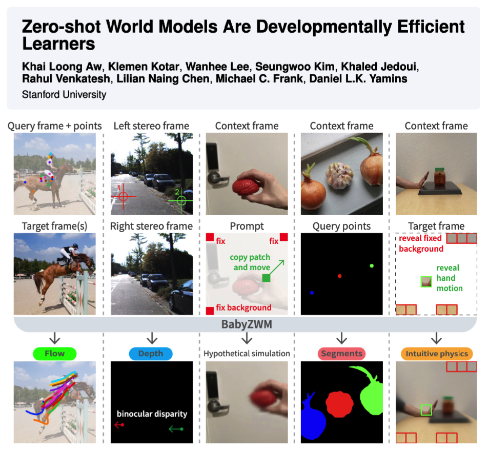 We introduce the Zero-shot World Model (ZWM), an approach that substantially narrows this gap. Even when trained on the first-person experience of a single child, BabyZWM matches state-of-the-art models on diverse visual-cognitive tasks – with no task-specific training, i.e., zero-shot.